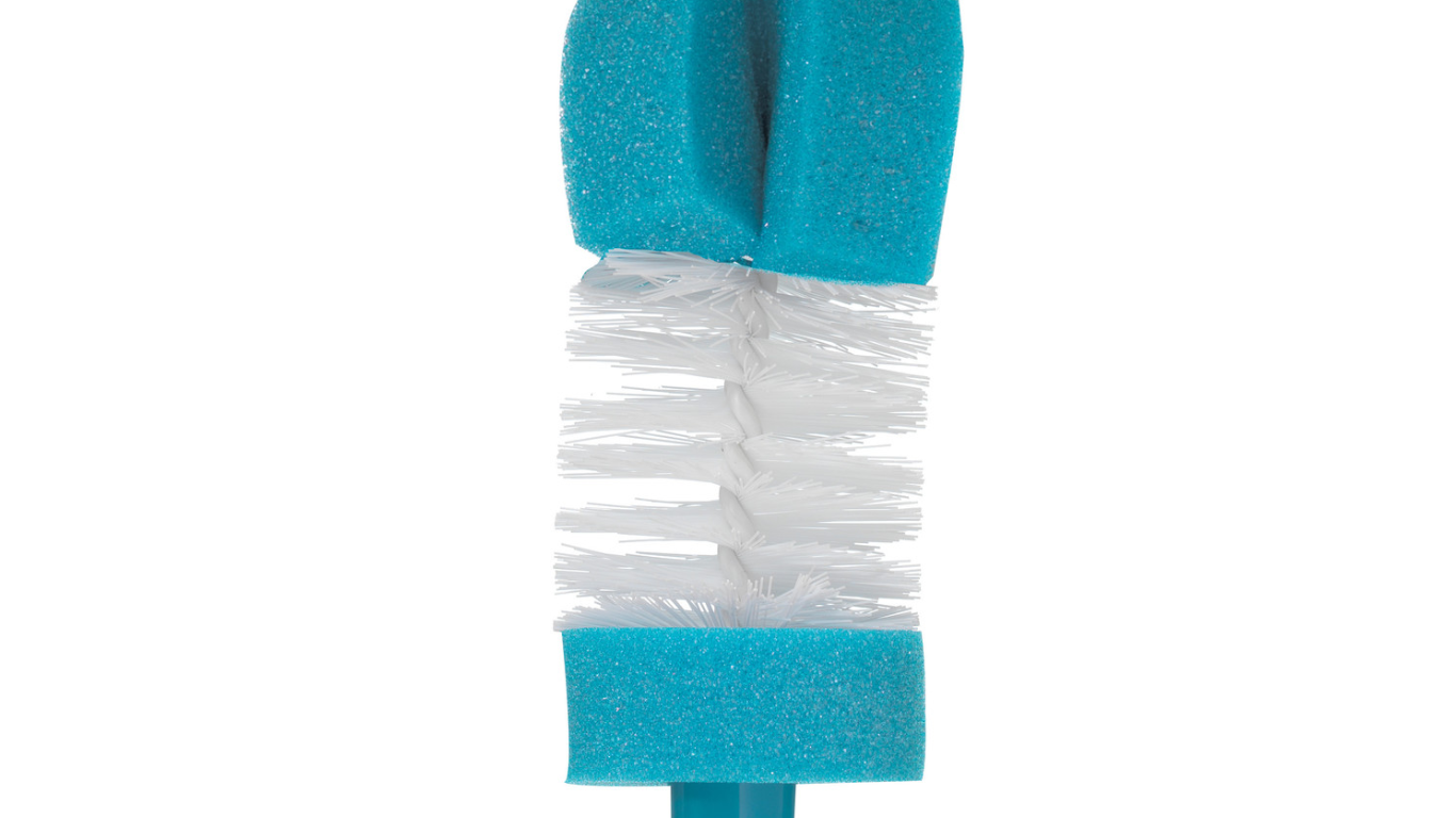 El cepillo de esponja doble para biberones de la marca The First Years, elimina los residuos del biberón. Es el artículo ideal para completar la limpieza de los biberones, chupones y demás articulos de la alimentación del bebé. Este cepillo para biberones tiene cerdas suaves y un cepillo de pezón giratorio que se almacena convenientemente en el mango. Asi que con este cepillo de The First Years, tendrás dos esponjas para facilitar la limpieza de los bordes y el fondo de los biberones de tu bebé.
